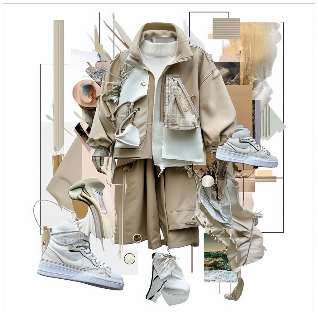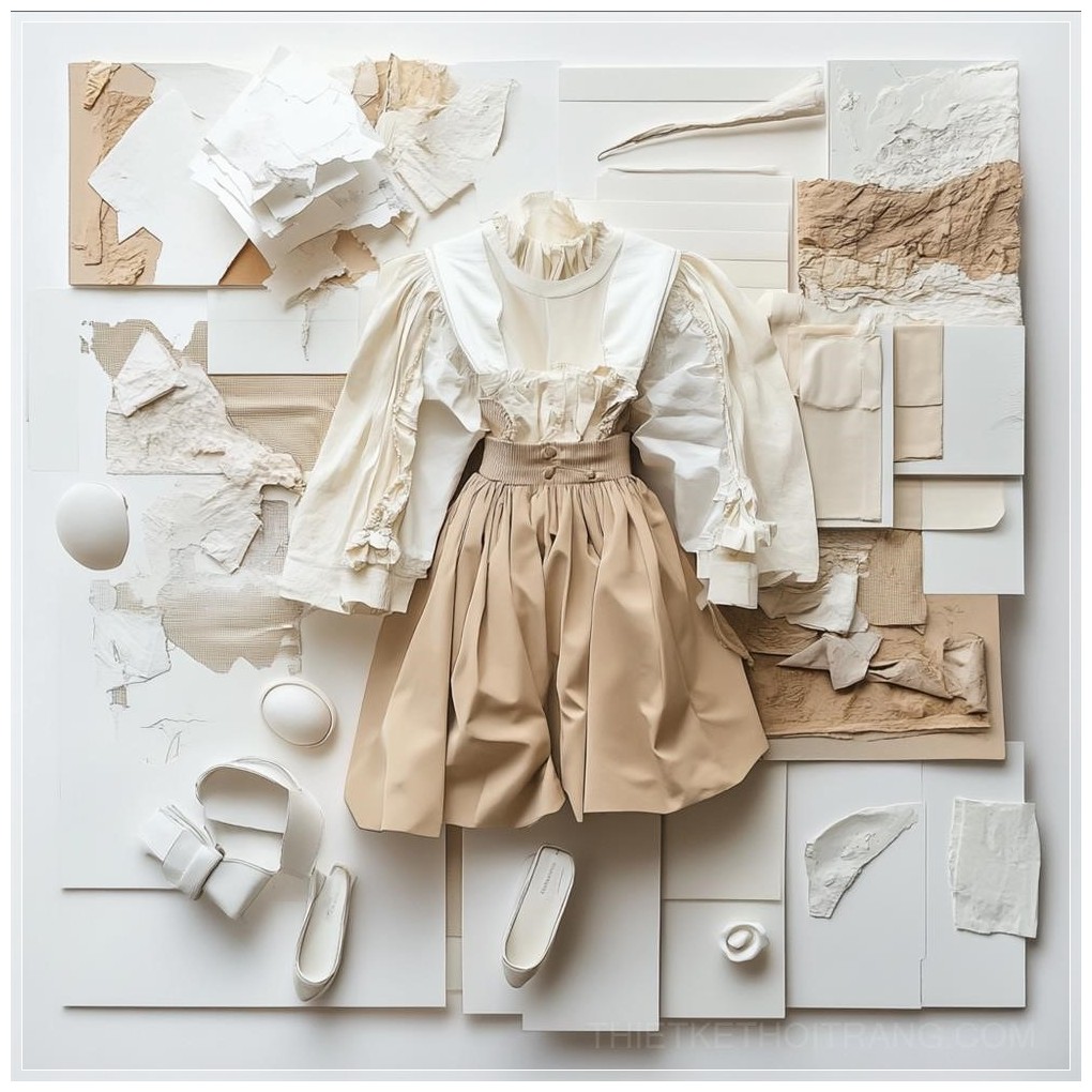 Một tổng hợp nghệ thuật của các bộ trang phục thời trang cao cấp màu be và trắng, nền trắng tinh khiết, tạo nên sự kết hợp thanh lịch và sang trọng, tôn vinh sự tinh tế trong thiết kế thời trang.