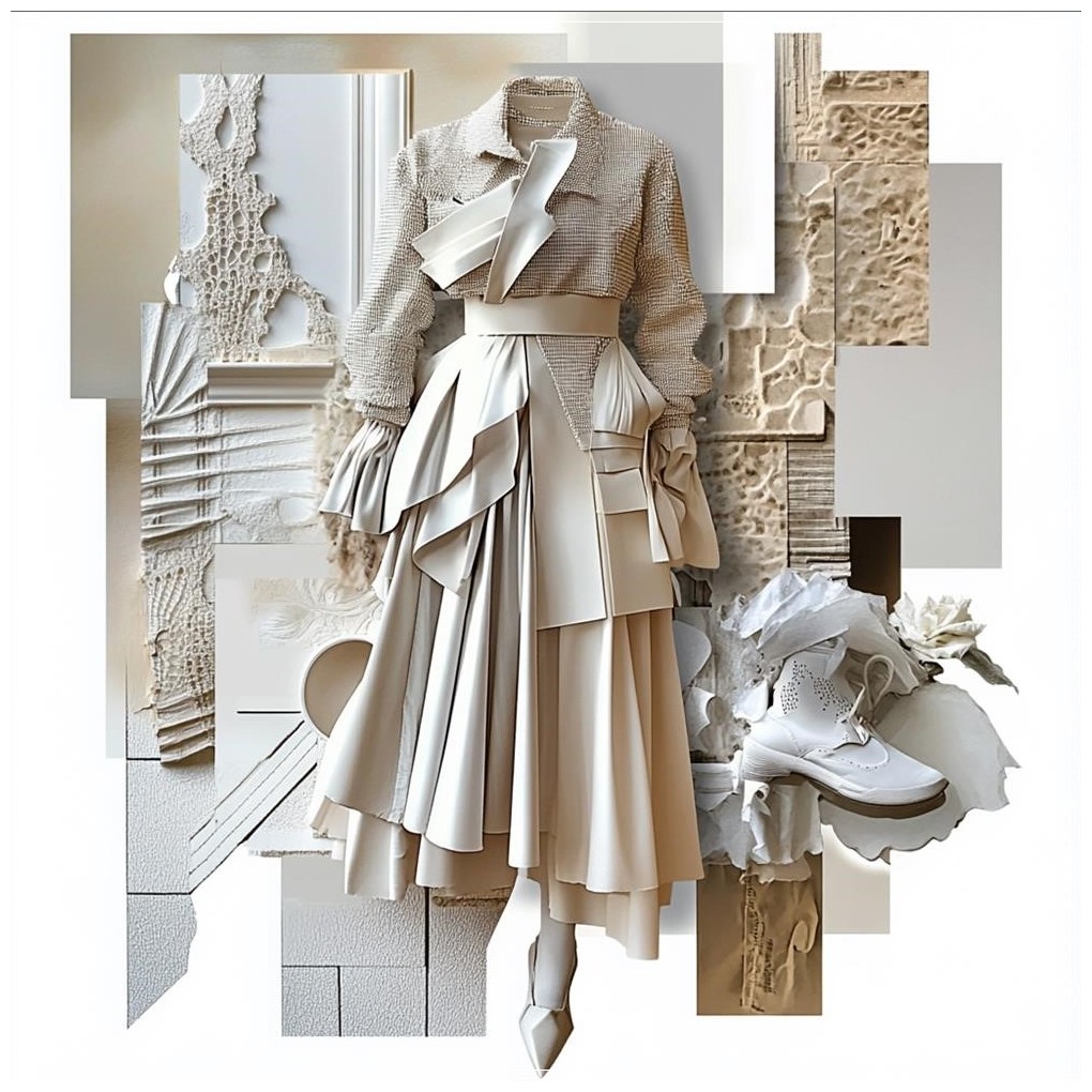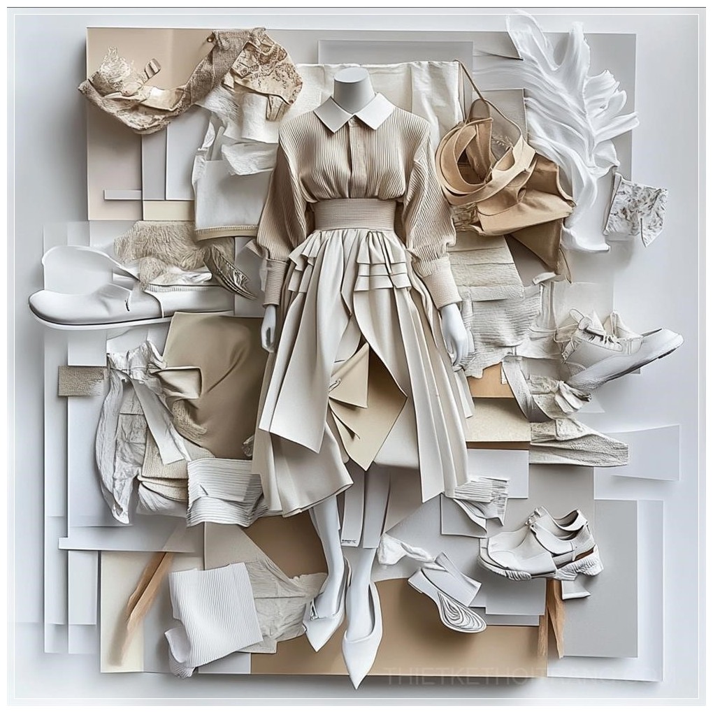 ARTISTIC COLLAGE OF BEIGE AND WHITE HIGH FASHION CLOTHES, WHITE BG