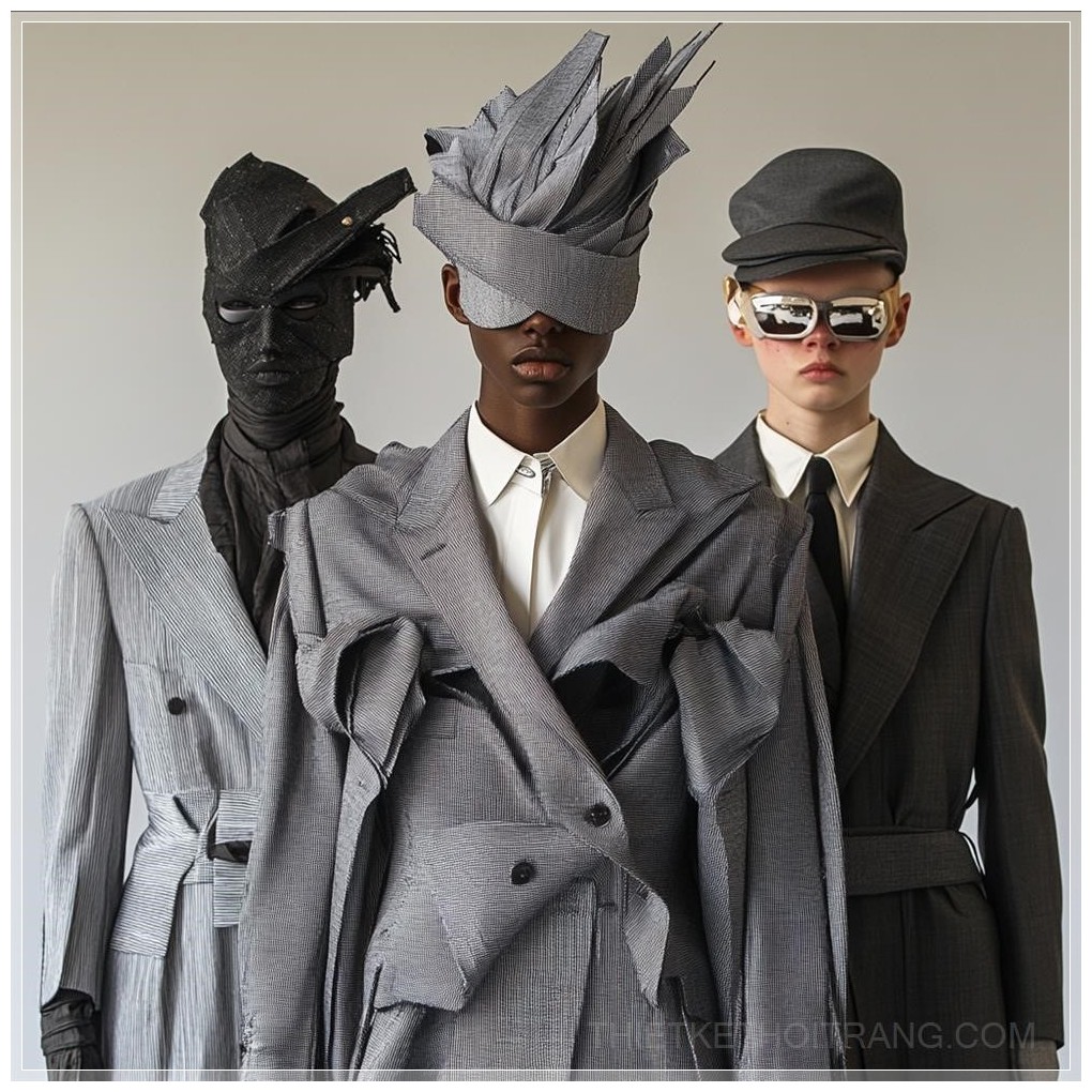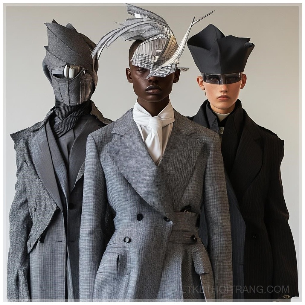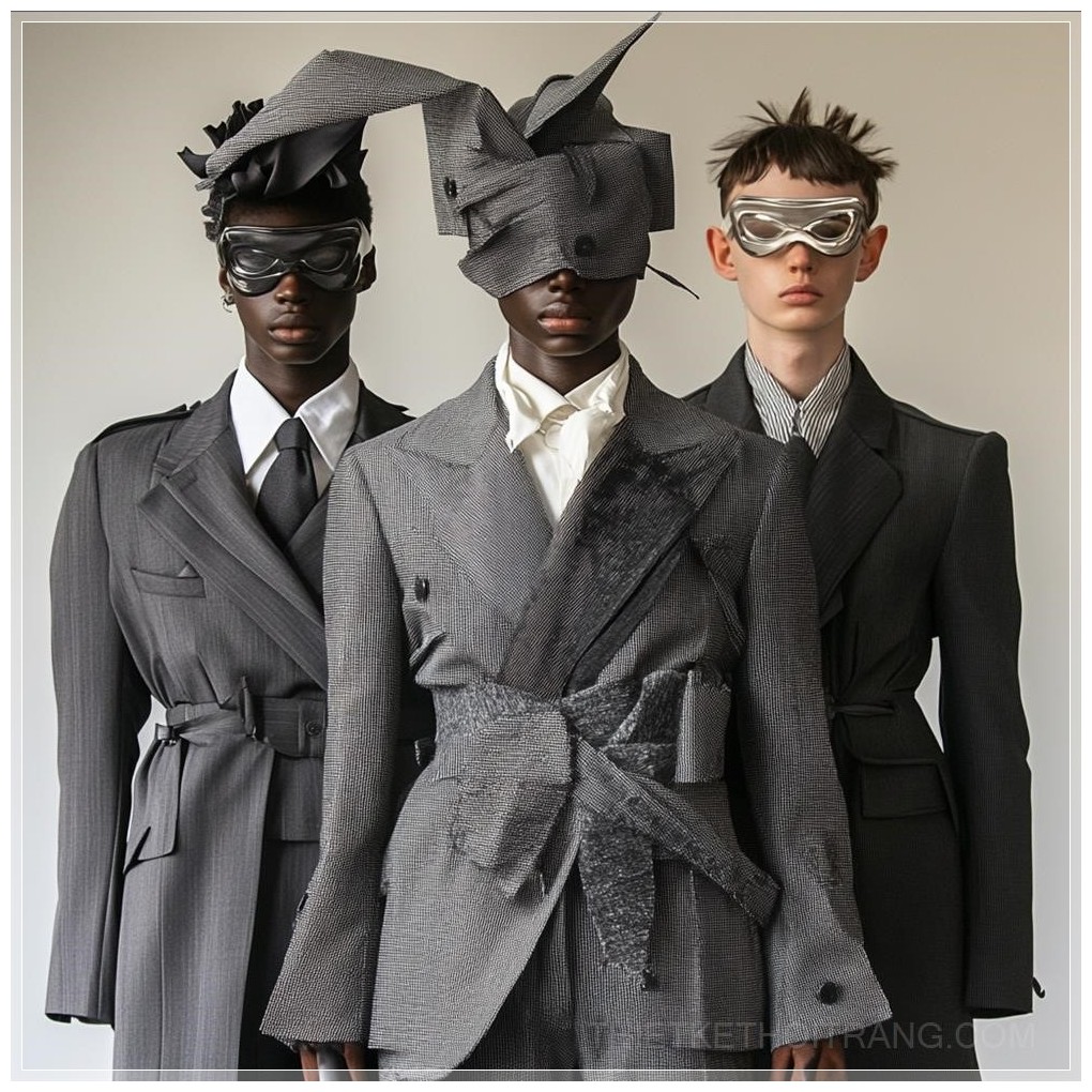 PROMPT: fashion models wearing deconstructed modern suiting inspired by super hero with Thom Browne aesthetics Ý Nghĩa: Các người mẫu thời trang mặc trang phục suit hiện đại deconstructed lấy cảm hứng từ siêu anh hùng với thẩm mỹ Thom Browne.