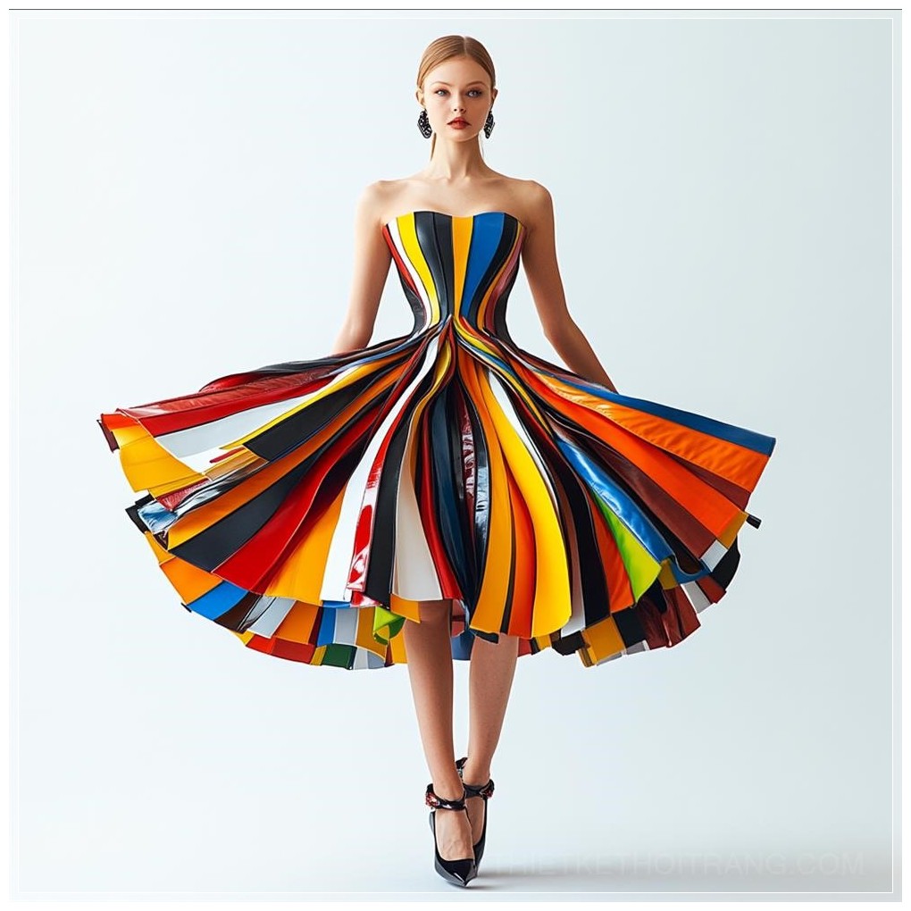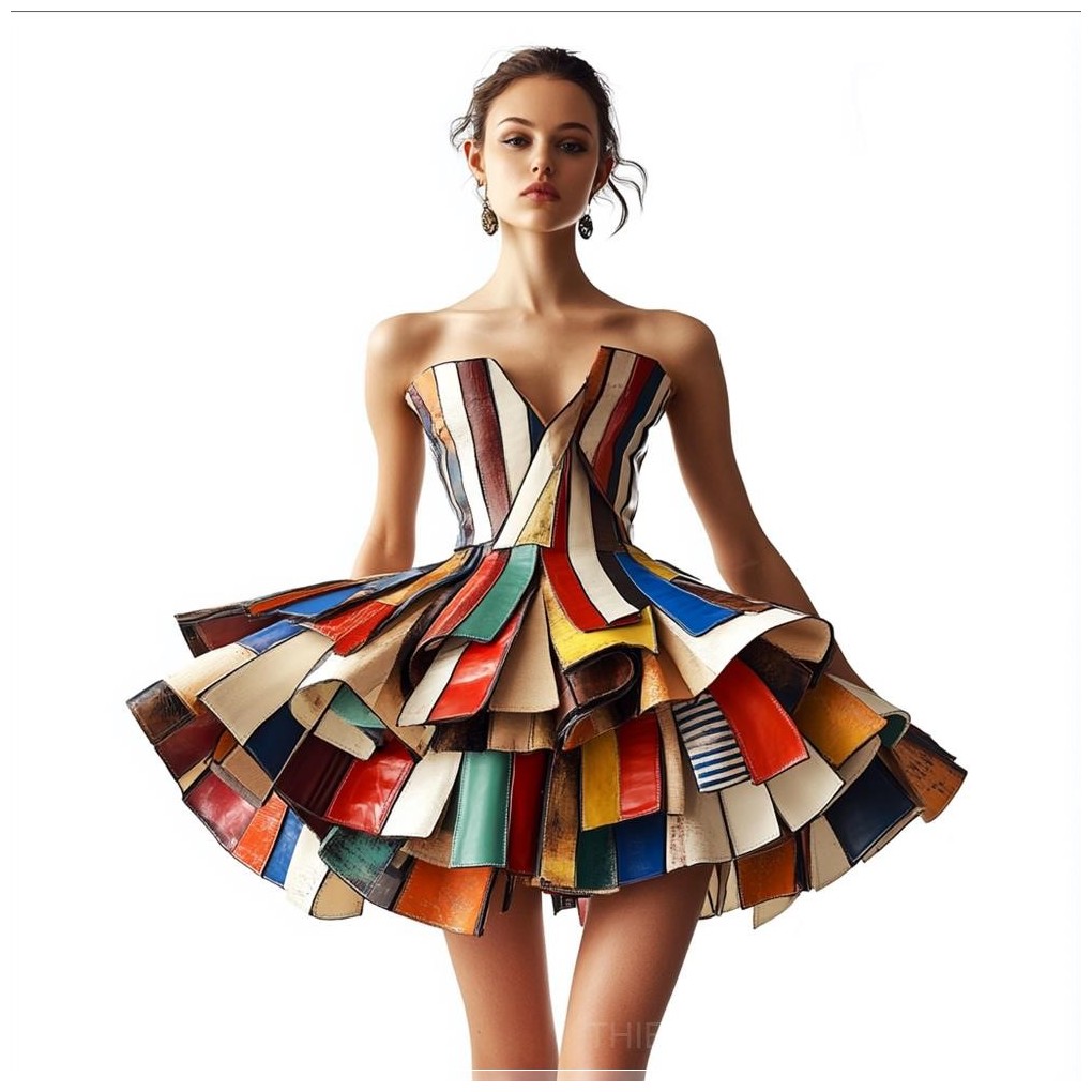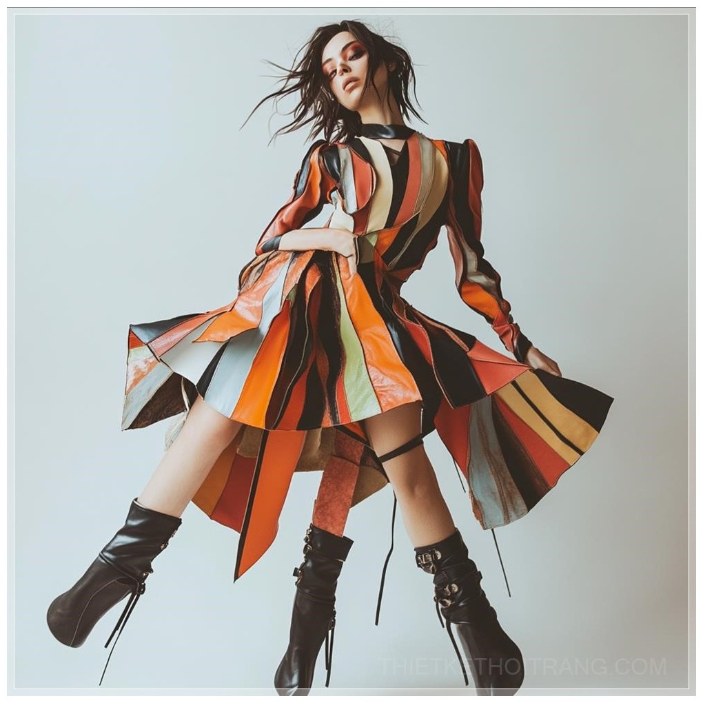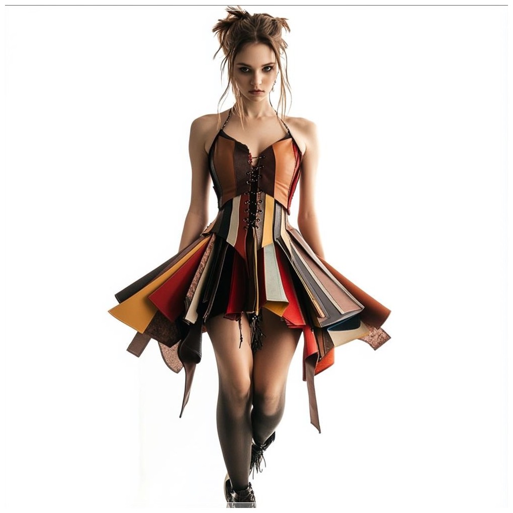 Một cô gái 20 tuổi mặc một chiếc váy phong cách năng động, với tông màu mạnh mẽ và sâu sắc, làm từ chất liệu da, các sọc không đều và họa tiết đa dạng, thời trang và sáng tạo. Nền trắng, chụp ảnh toàn thân, góc nhìn chính diện.