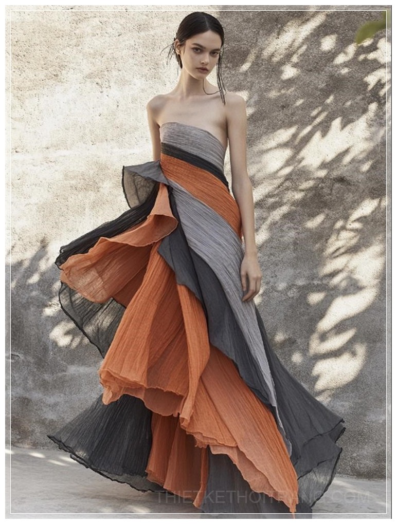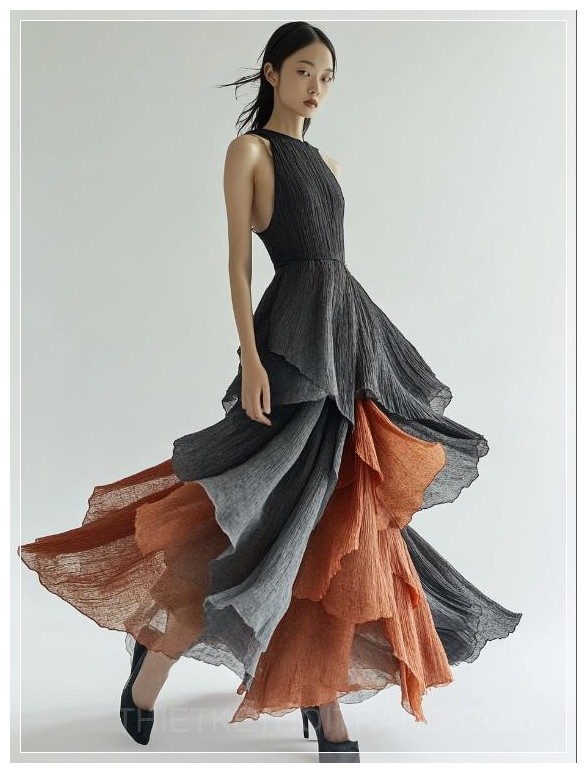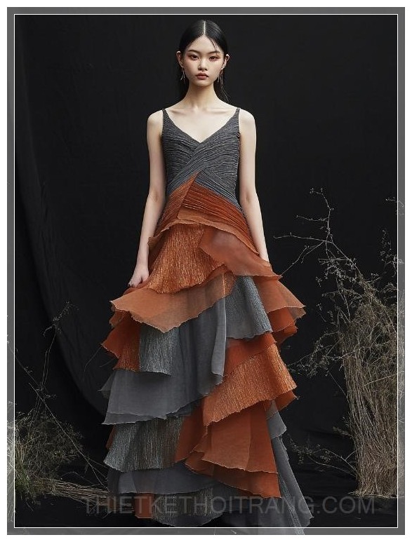 Váy A-line với đường viền bất đối xứng rủ xuống, lấy cảm hứng từ các lớp đá của núi Taihang, vải organza xếp lớp tạo ra kết cấu địa chất, bảng màu tông đất với màu xám đá phiến và đất nung, cổ áo xếp ly thủ công mô phỏng các họa tiết bị mài mòn bởi gió, thắt lưng với vải buông mềm mại có đường viền thô, phong cách tối giản hiện đại.
