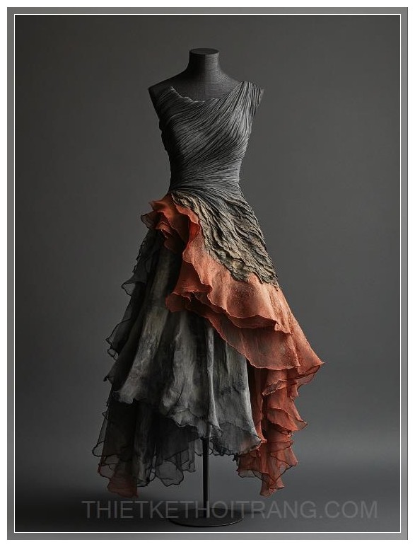A-line silhouette dress with cascading asymmetric hemline inspired by Taihang Mountain rock strata, layered organza fabric creating geological texture, earth tone color palette of slate grey and terracotta, hand-pleated neckline mimicking wind-eroded patterns, sculptural waist drapery with raw-edge finishing, modern minimalist aesthetic --ar 3:4