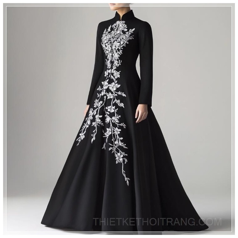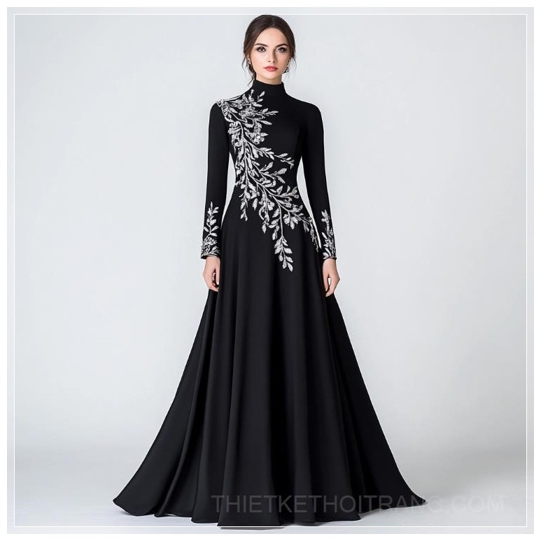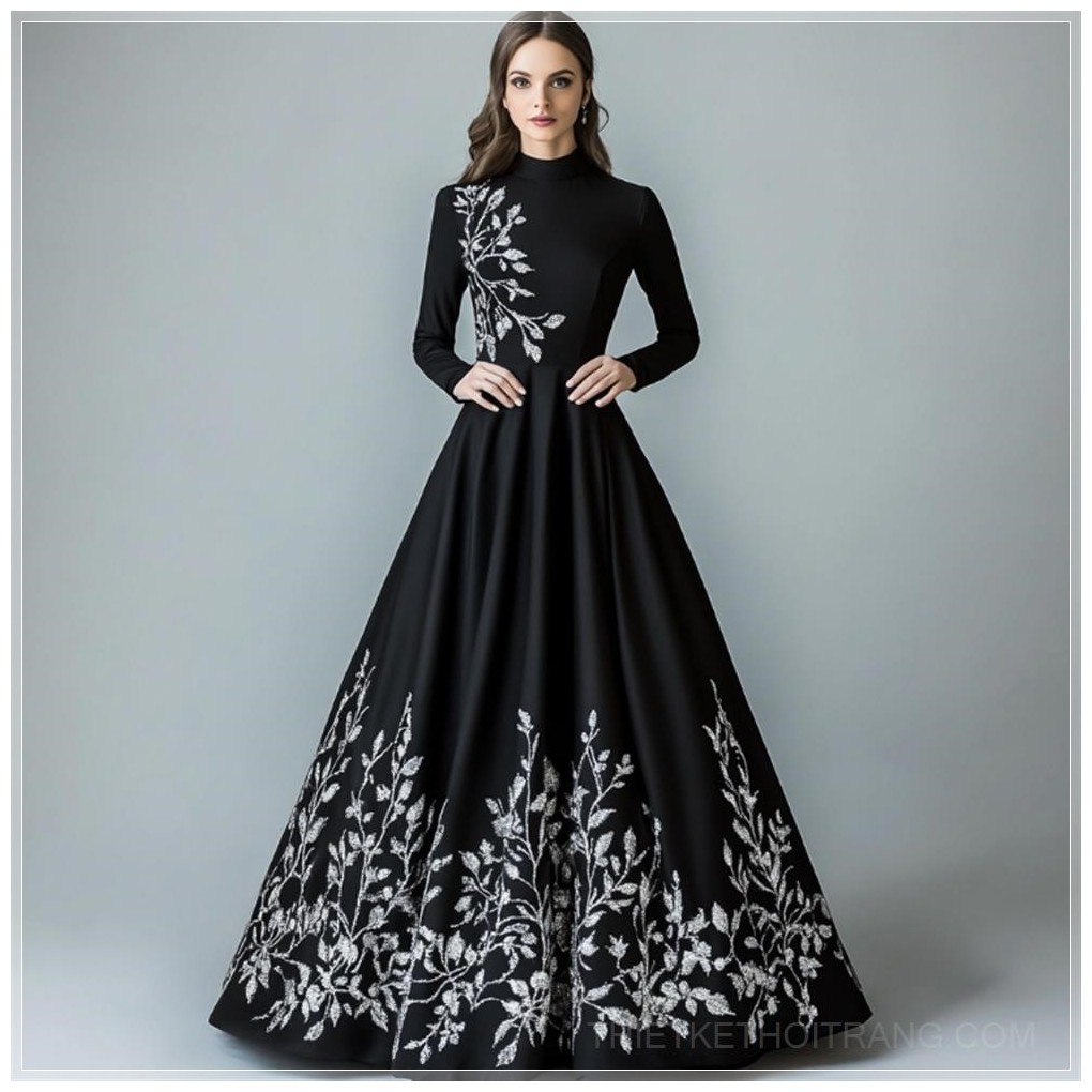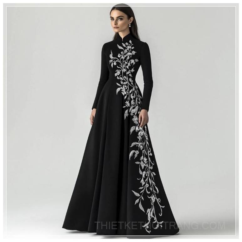 Một chiếc váy dạ hội dài thanh lịch được thiết kế từ chất liệu vải đen cổ điển với bề mặt mượt mà giống satin. Váy có cổ cao và tay dài, tạo nên vẻ thanh lịch và tinh tế. Chi tiết nổi bật của chiếc váy là những đường thêu bạc tinh xảo, giống như hoa văn hoa hoặc lá, được thêu bất đối xứng trên thân váy và kéo dài xuống phía trước.