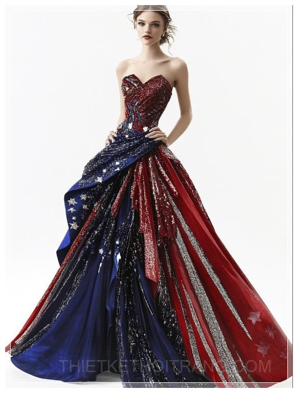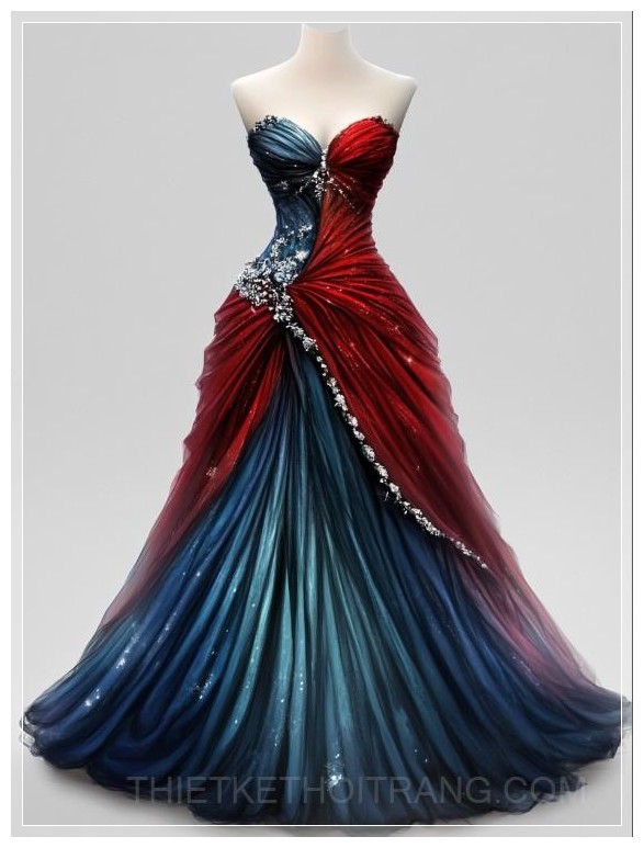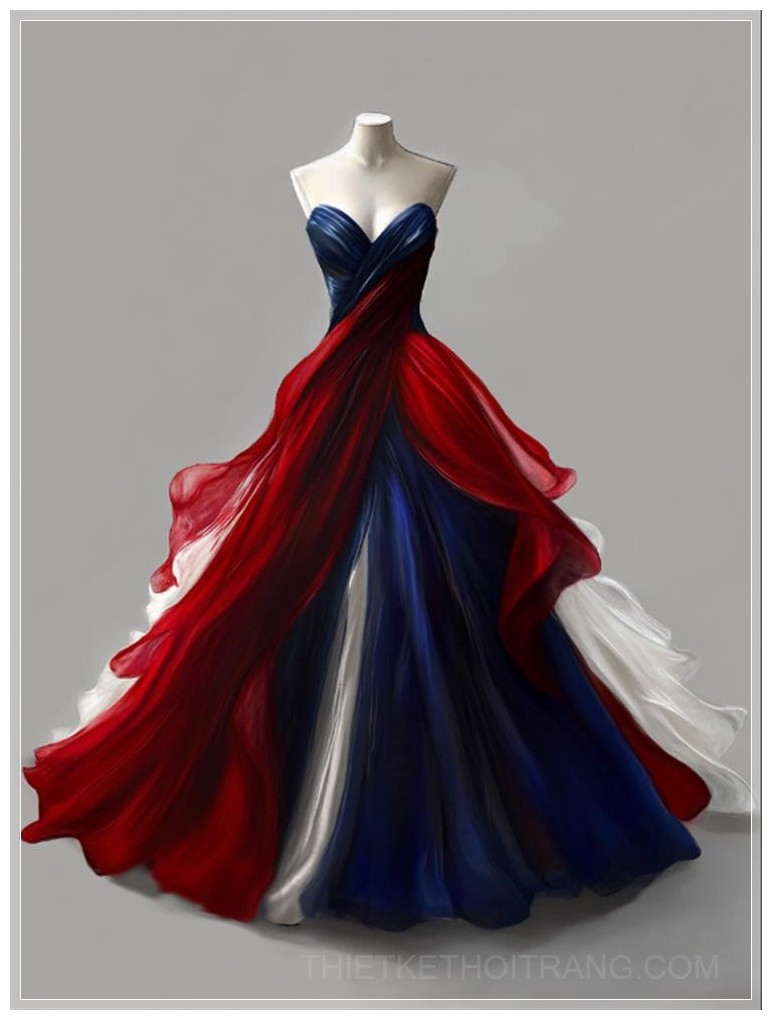 PROMPT: design me a gorgeous high-fashion elegant evening gown that's red white and blue. --ar 3:4 --v 6.1 Ý Nghĩa: Thiết kế cho tôi một chiếc đầm dạ hội sang trọng, tinh tế với màu đỏ, trắng và xanh dương.