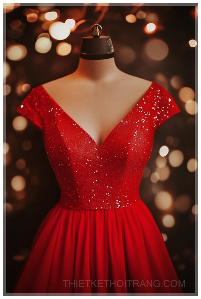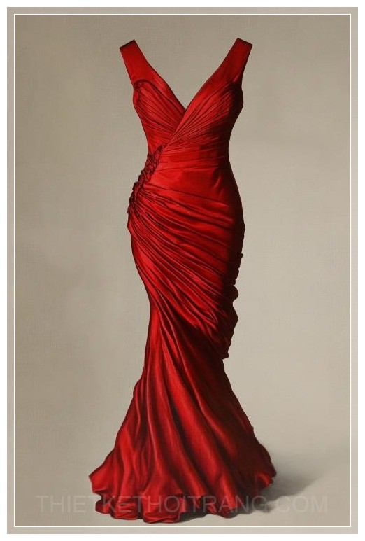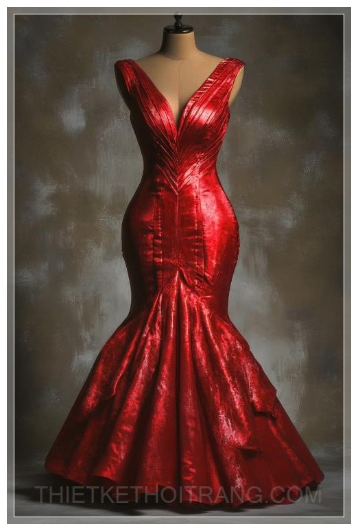 PROMPT: realistic red dress --ar 2:3 --no people Ý Nghĩa: Một chiếc đầm đỏ sắc nét, thiết kế tinh tế và chân thực, tôn lên vẻ đẹp nổi bật và sự quyến rũ của người mặc.