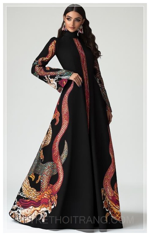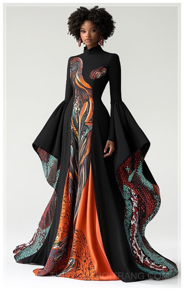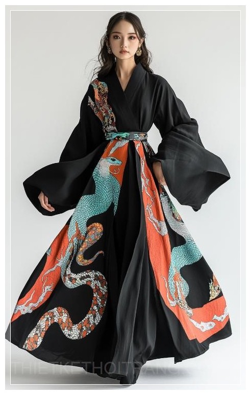 Một chiếc đầm đen dài với tay áo rộng, trang trí họa tiết rắn màu sắc trên một bên thân, thiết kế dựa trên ý tưởng sinh học, được một phụ nữ mặc, nền trắng.