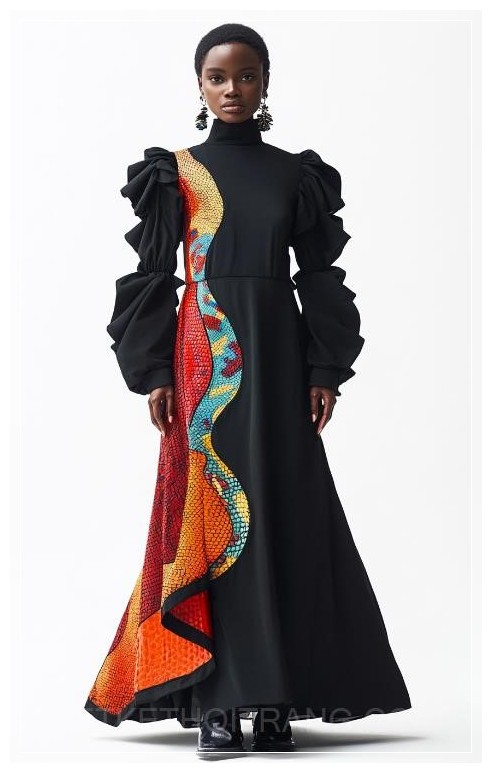 A black long dress with large sleeve and colorful snake print on the side, bio based idea, a woman wearing it, white background. --ar 5:8 --s 250