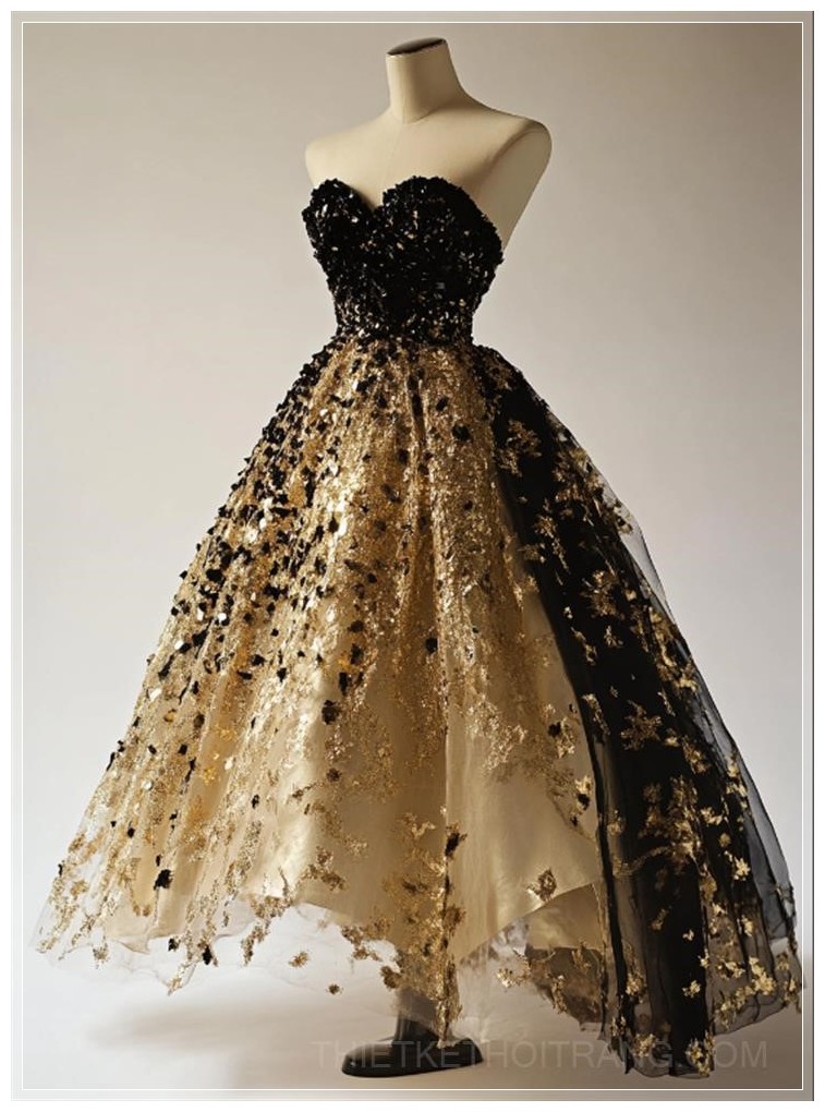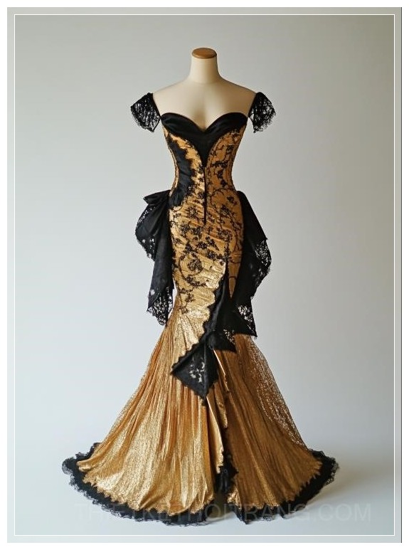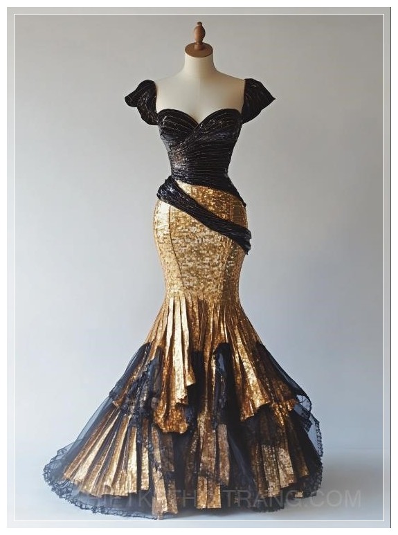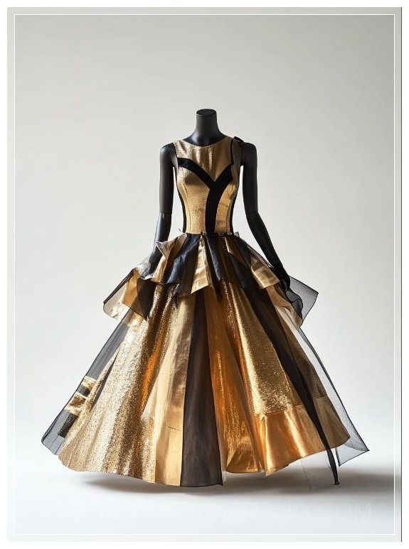 PROMPT: a haute couture gold and black dress on a mannequin, on a plain white background, vogue --ar 14:19 Ý Nghĩa: Một chiếc đầm haute couture màu vàng và đen, được trưng bày trên manocanh, nền trắng đơn giản, mang phong cách thời trang của Vogue.