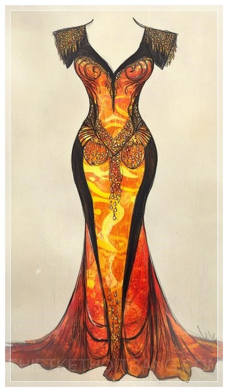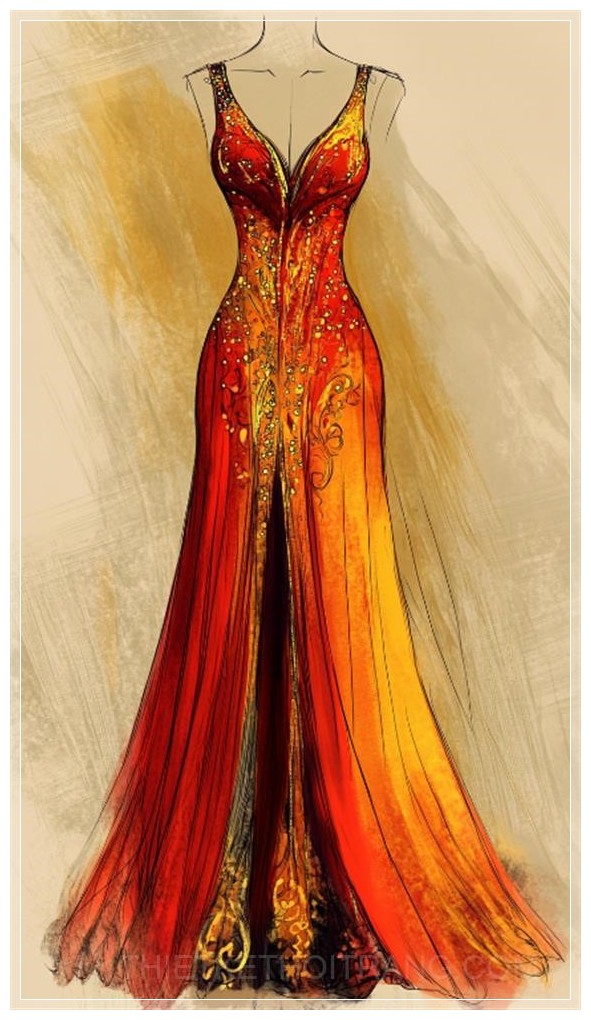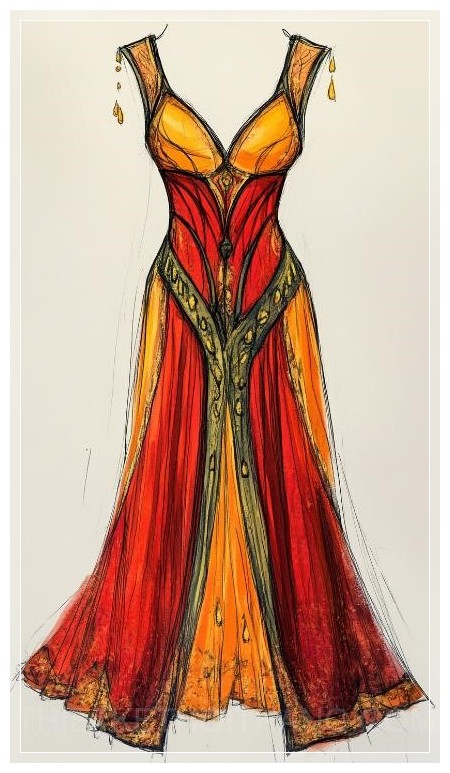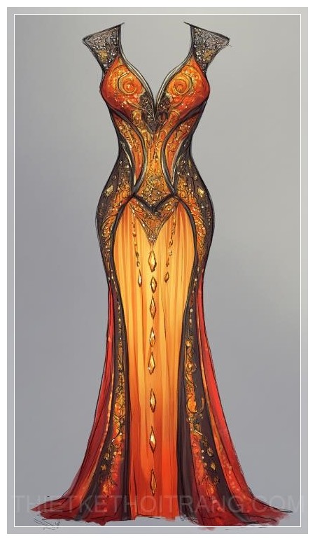 Tạo cho tôi một bản phác thảo của chiếc váy Minoan với màu sắc chủ đạo là cam đỏ và vàng, cổ cao, vừa vặn với đường cắt hình chữ V, được trang trí bằng các thiết kế bóng bẩy giống như những giọt mưa.