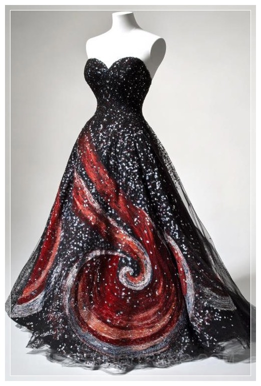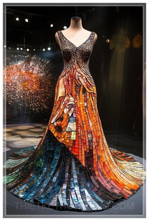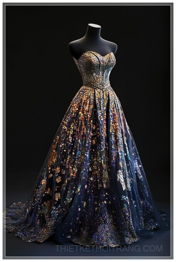 PROMPT: gown with skirt of manifold mosaic murmuration --ar 2:3 --v 6.1 Ý Nghĩa: Một chiếc đầm với thiết kế chân váy làm từ những mảnh ghép mosaic, tạo ra hiệu ứng chuyển động như đàn chim bay, đầy ấn tượng và quyến rũ.