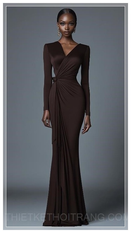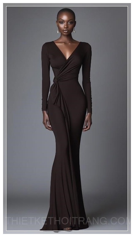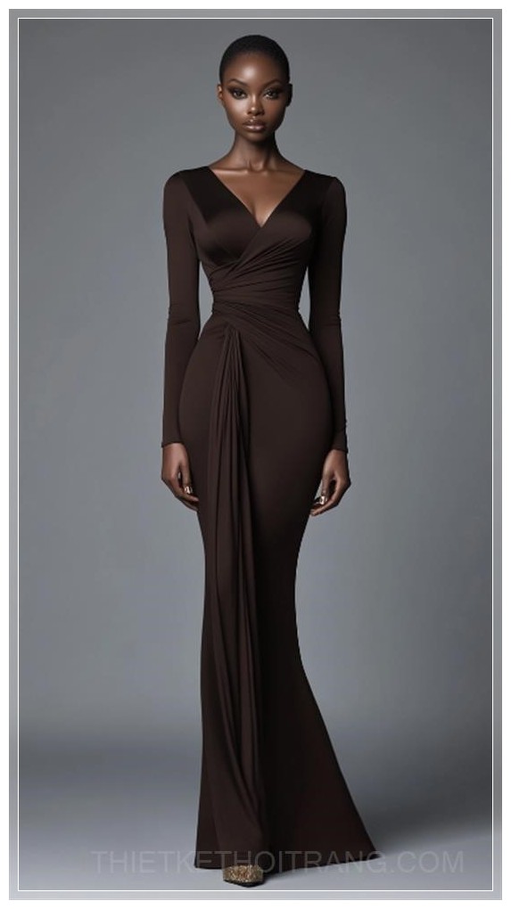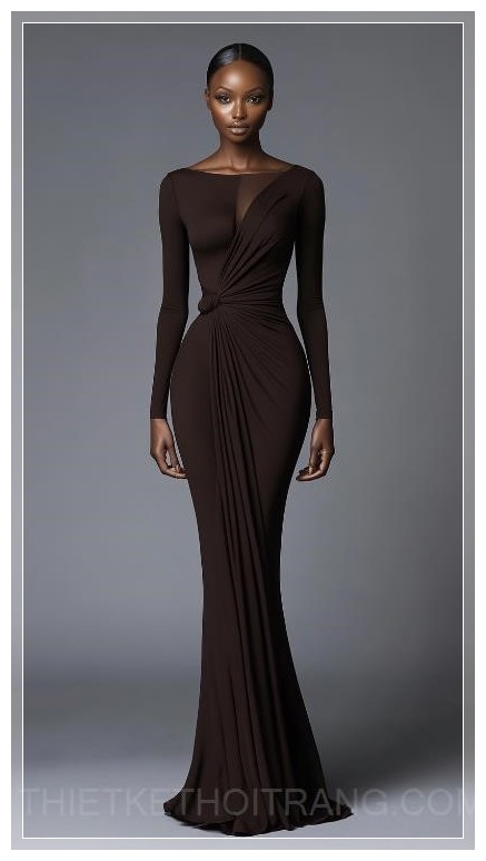 Một chiếc đầm bodycon dài và thẳng, màu nâu sô-cô-la, với tay dài và điểm nhấn là chiếc nơ ở phần eo, tạo nên vẻ ngoài thanh lịch và duyên dáng.
