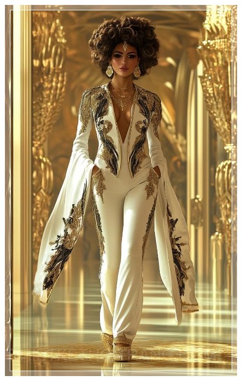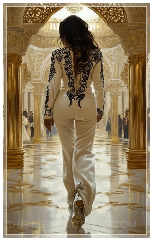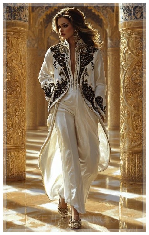 a gourgeous arab lady, walking in a golden hallway, wearing a gorgeous white velvet jacket and loose pants. The jacket has black embroidery, very detailed. she has golden shoes. Her hair is glam and voluminous. Very realistic --ar 5:8