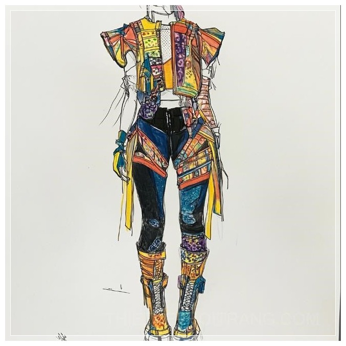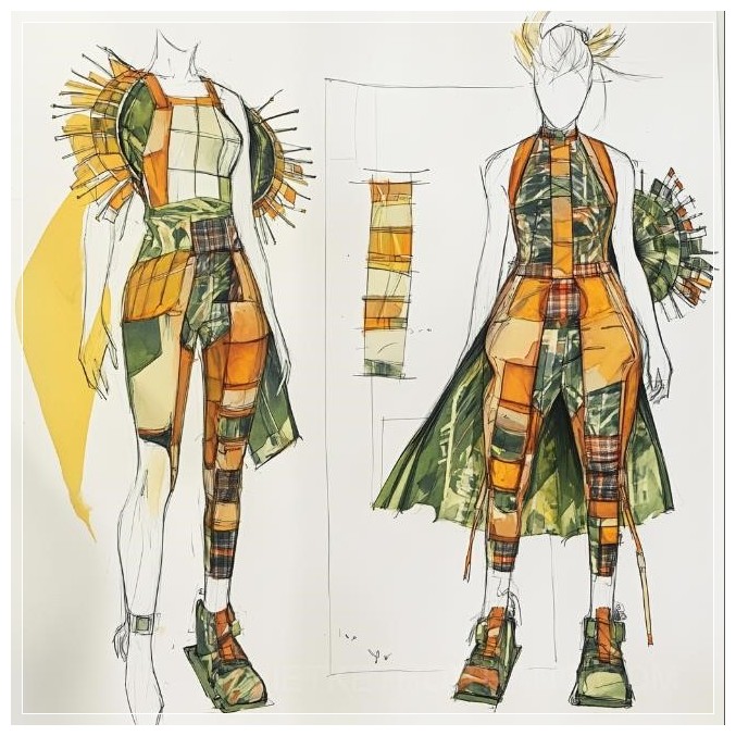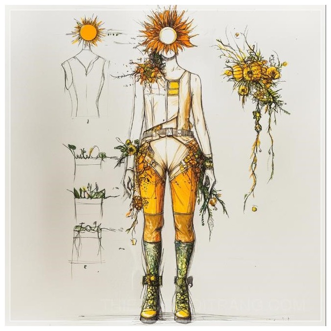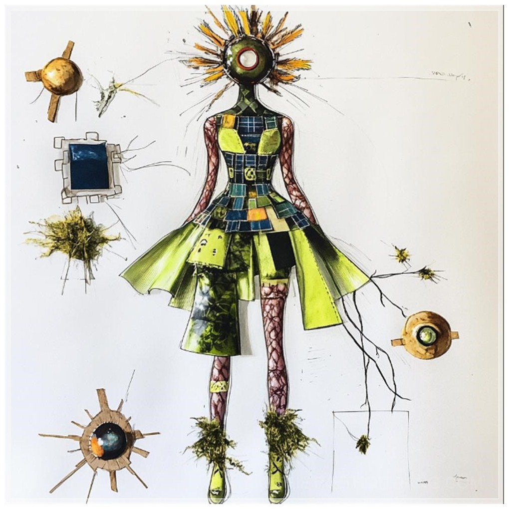 Một bản phác thảo thiết kế trang phục cho một thiếu niên theo phong cách Elena của thời trang solar punk, nhấn mạnh vào các vật liệu tái tạo và chất liệu hữu cơ.