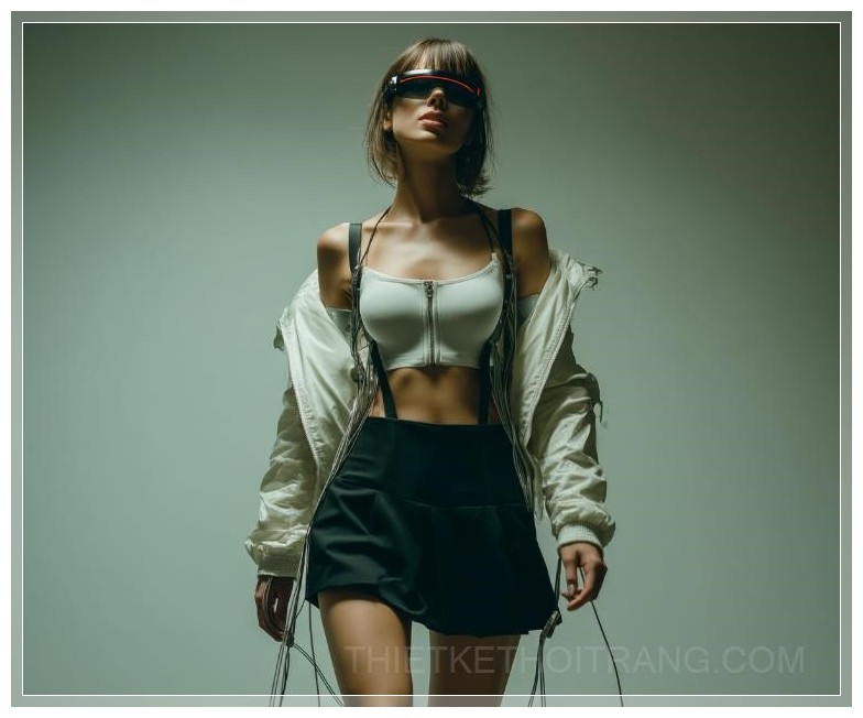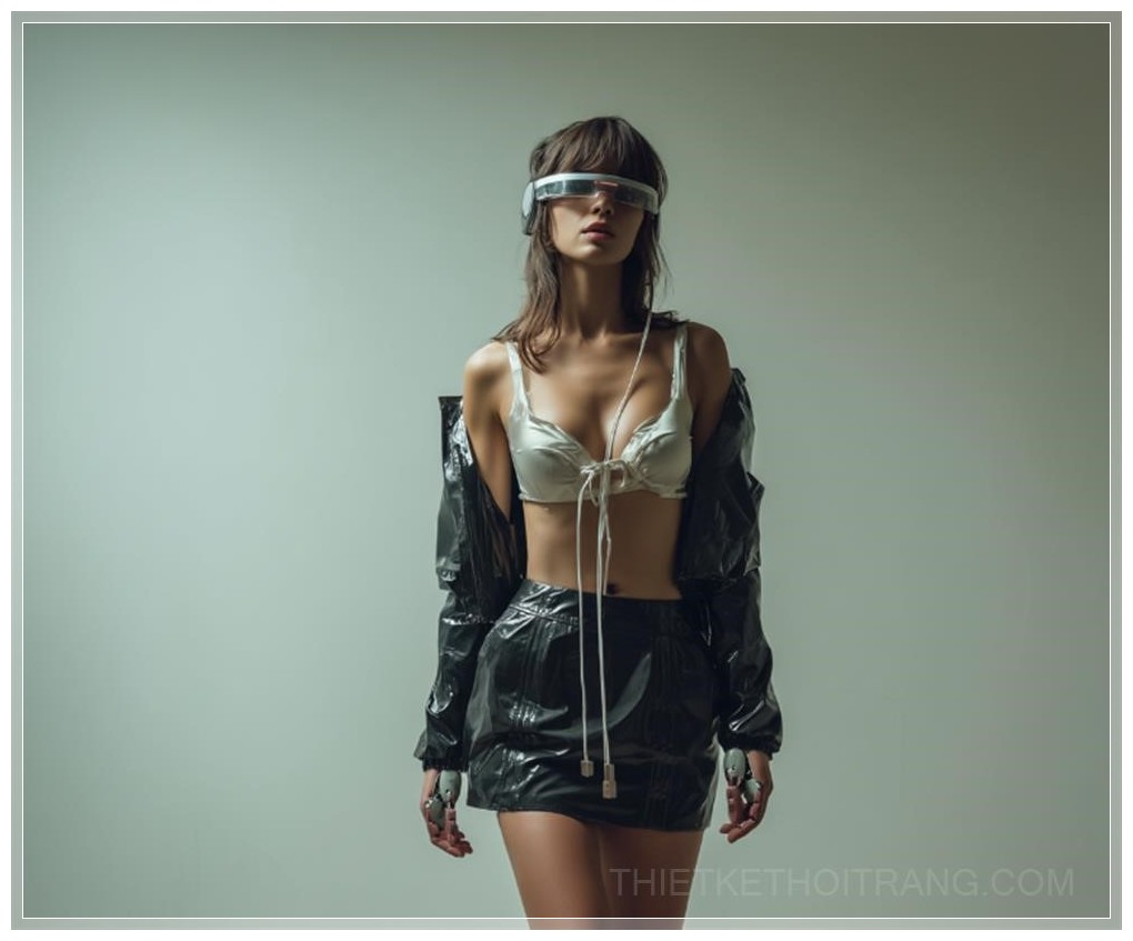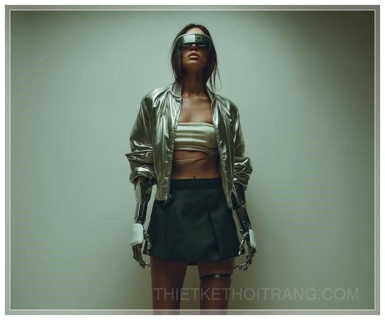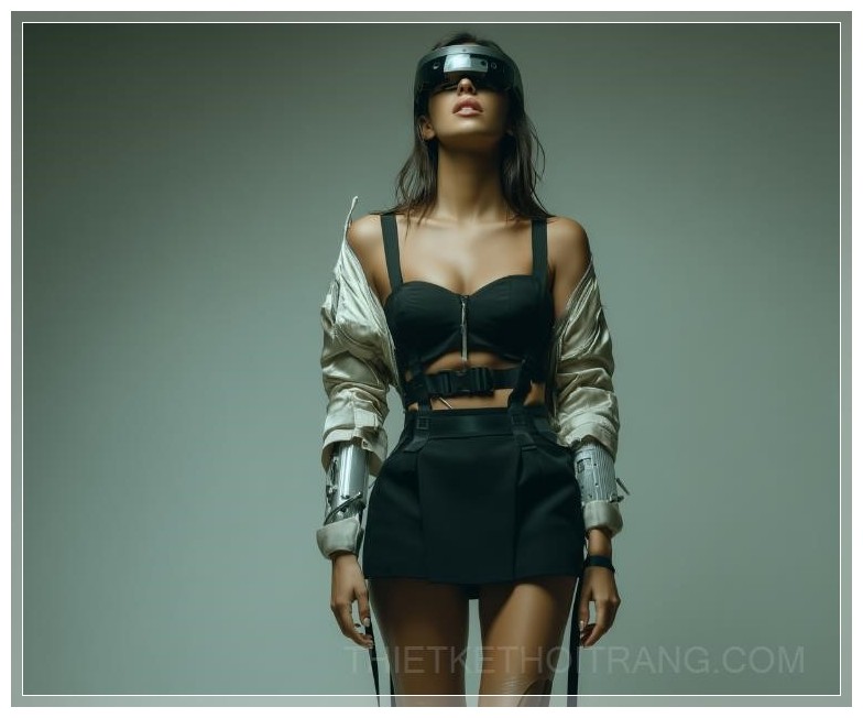 Cô gái cyborg phong cách cyberpunk. Vô cùng hấp dẫn, quyến rũ. Chân dung toàn thân. Thân người con người, tay và chân là robot. Đứng đối diện, góc nhìn từ phía trước. Máy ảnh Sony A7R IV Pro. Mặc một chiếc chân váy đen ngắn, kính mắt ảo hologram, và áo khoác cropped mở. Khuôn mặt rõ nét trong khung hình.