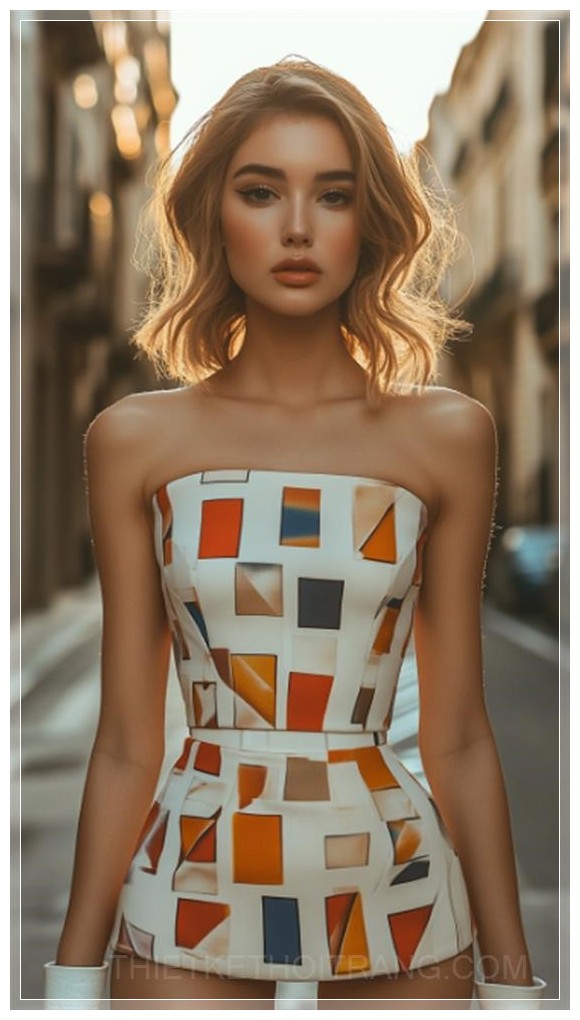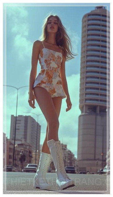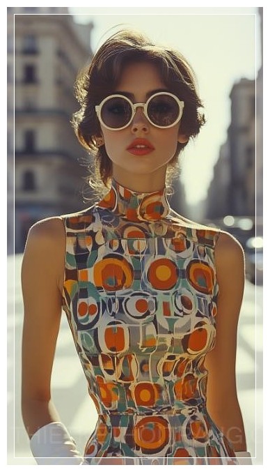 Một người mẫu Tây Ban Nha vào thập niên 1960 đang sải bước trên đại lộ Barcelona, toàn thân, trong bộ váy minidress họa tiết hình học, kết hợp với đôi ủng go-go trắng. Phía sau là nền kiến trúc hiện đại, ánh sáng hoàng hôn tạo nên không gian rực rỡ.