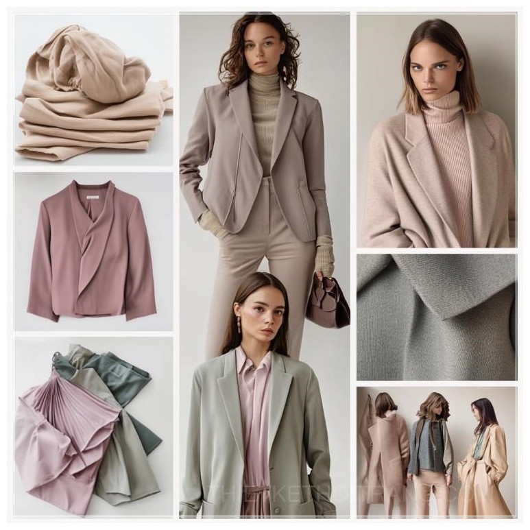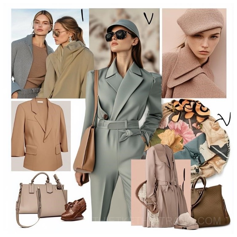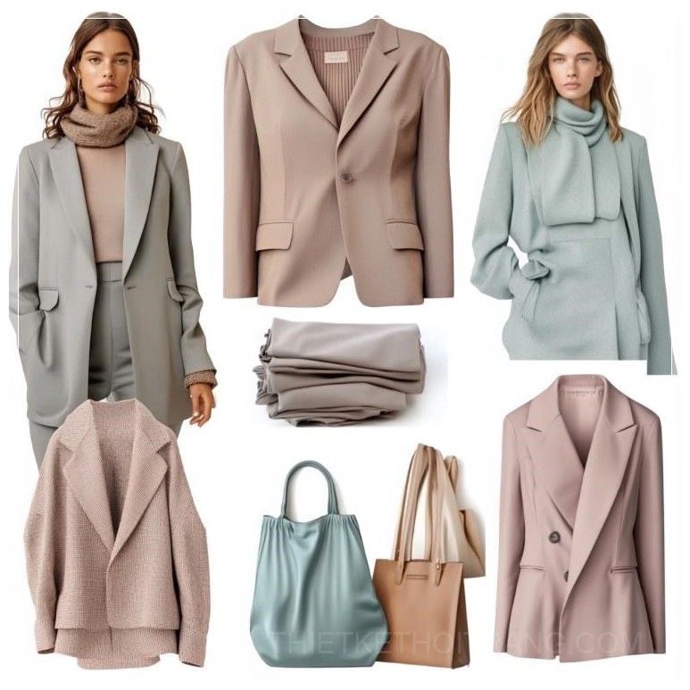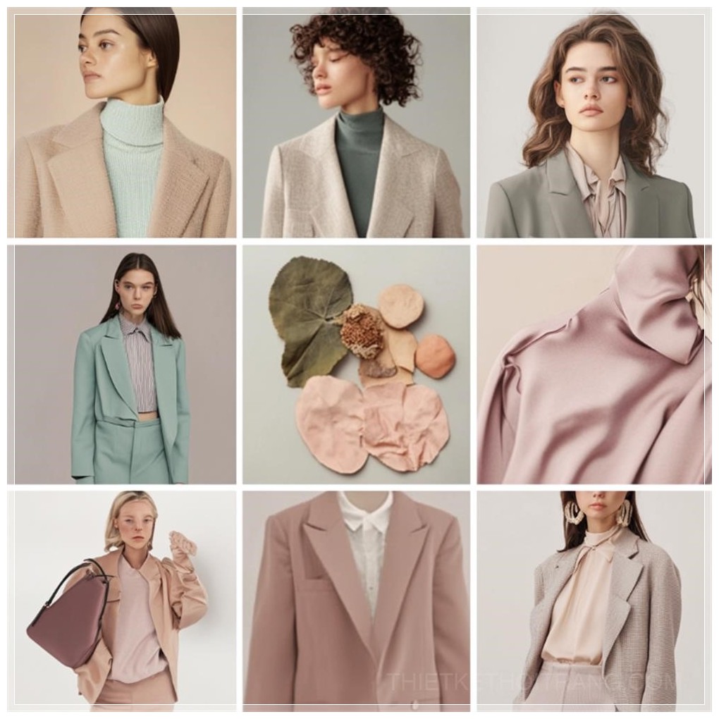 Bảng moodboard cho bảng màu của bộ sưu tập mùa thu-đông nữ, với các tông màu hồng phấn, xám lavender, xám teal, be nhạt, xanh trời, lá bay và điểm nhấn hồng san hô. Bao gồm hình ảnh các bộ trang phục khác nhau như áo blouse, quần tây, túi xách, blazer, áo khoác, và jacket, với các người mẫu nữ tạo dáng trong từng bộ trang phục. Khuôn mặt của các người mẫu cần chi tiết và rõ nét. Các bộ trang phục phải hiện đại, phong cách và thời thượng, tất cả được đặt trên nền trắng sạch sẽ.