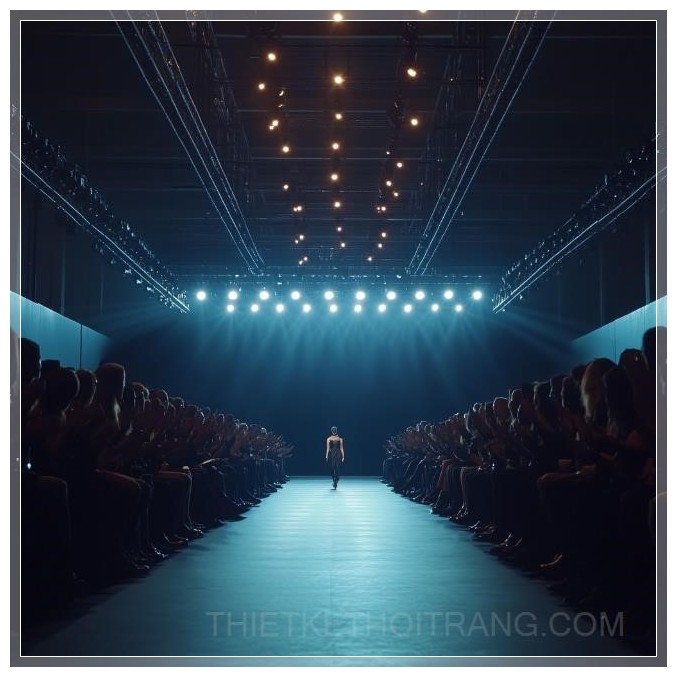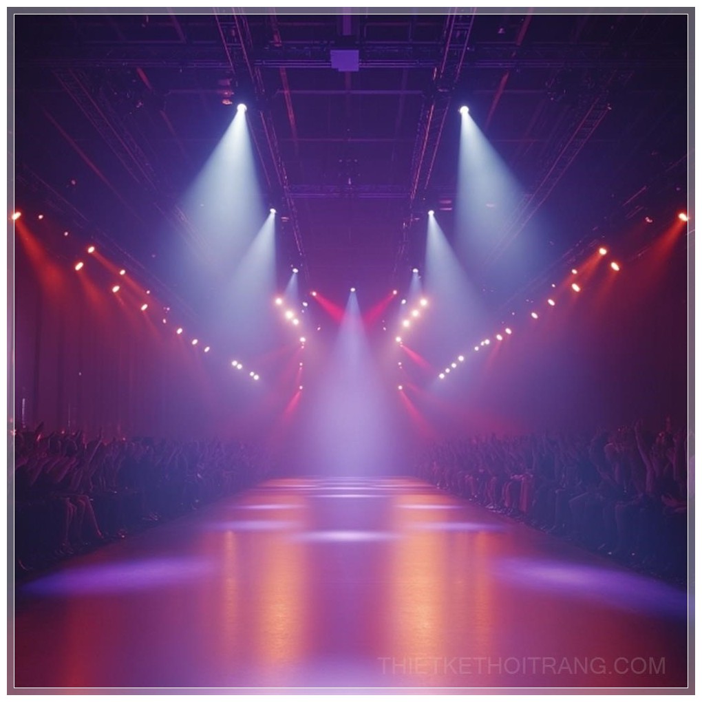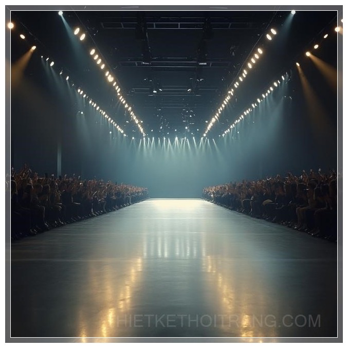 Sàn diễn thời trang trống, ánh sáng mạnh mẽ chiếu từ trên cao, đám đông cổ vũ, trọng tâm là con đường catwalk, 4k.