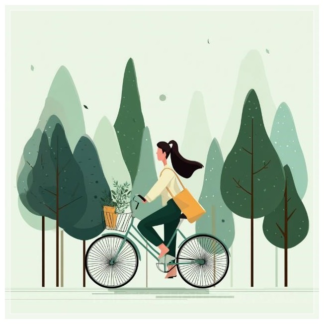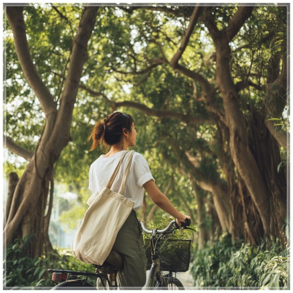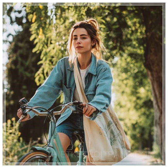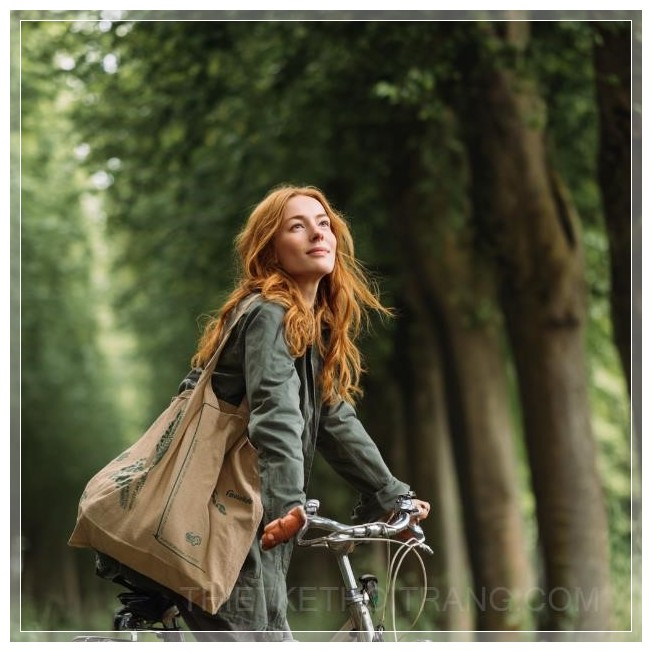 Hình ảnh cho thấy một cô gái đang đạp xe, mặc trang phục giản dị, với một chiếc túi tái sử dụng treo thoải mái trên vai, nhấn mạnh sự quan tâm của cô ấy đến môi trường và lối sống năng động. Những cây cổ thụ dày đặc xuất hiện phía nền tạo nên không khí hài hòa và tươi mới của thiên nhiên. Toàn bộ hình ảnh truyền tải cảm giác về một buổi đi bộ năng động trong không khí trong lành và ý thức bảo vệ môi trường.