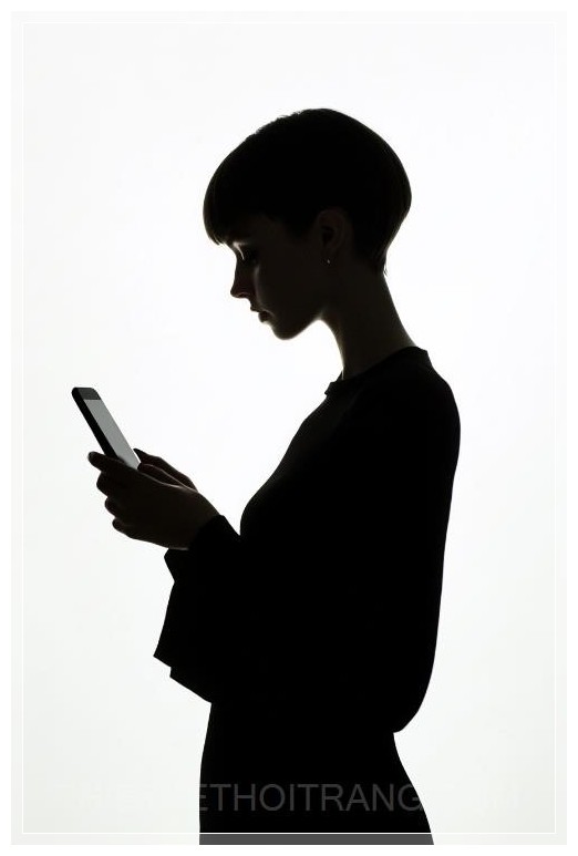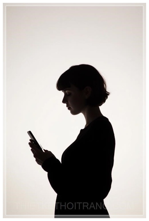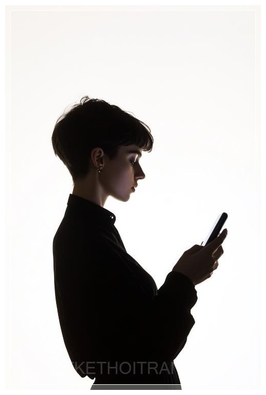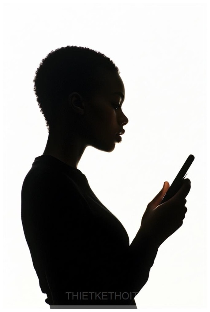 Một cô gái trẻ với tóc ngắn, mặc áo đen và đang cầm chiếc iPhone trong tay, tạo thành một hình bóng rõ nét khi ánh sáng từ màn hình điện thoại chiếu vào. Phông nền màu trắng làm nổi bật hình bóng của cô. Cô không có biểu cảm trên khuôn mặt, nhìn vào màn hình điện thoại. Hình dáng của cô được chiếu sáng từ một phía, với toàn bộ cơ thể được thể hiện qua dáng đứng nghiêng. Cảnh tượng này ghi lại khoảnh khắc cô chăm chú nhìn vào không gian, trong khi tương tác với công nghệ, với phong cách ảnh chân thực.