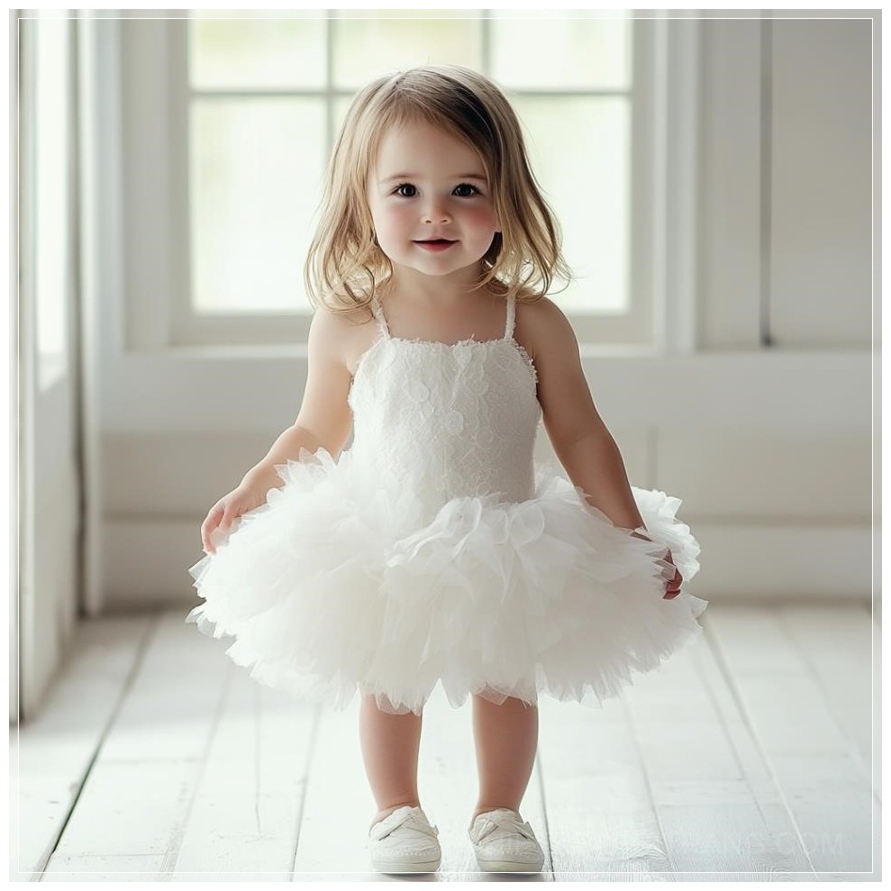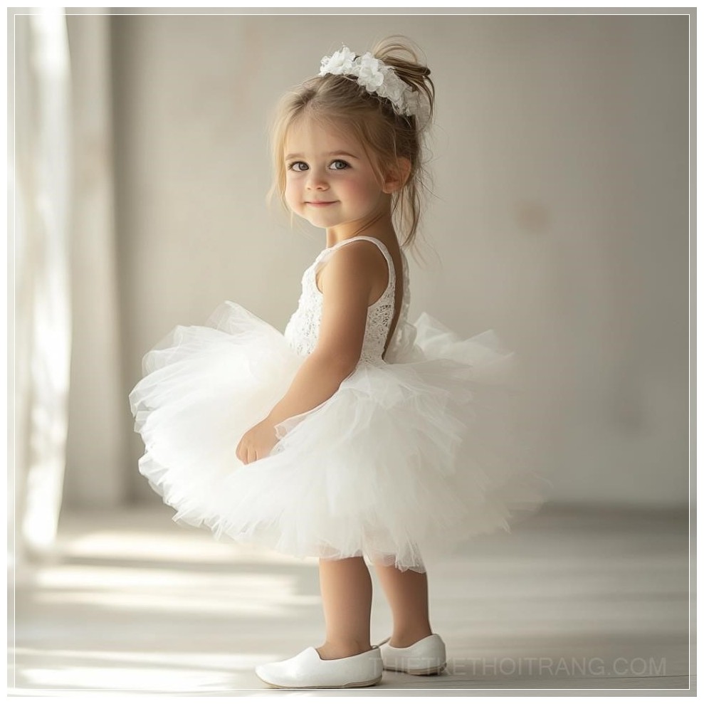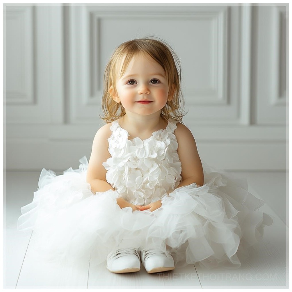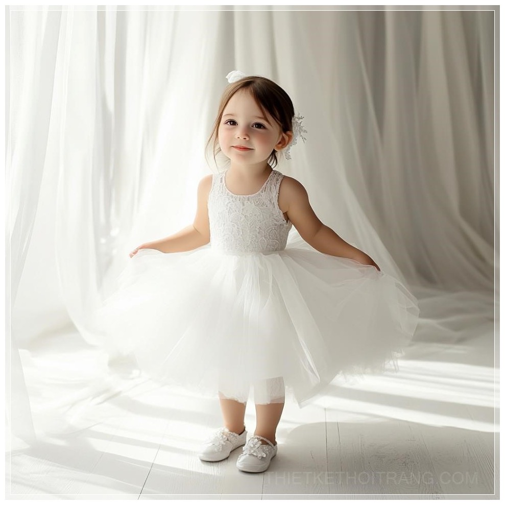 Trong một không gian studio tràn ngập ánh sáng tự nhiên, một cô bé đứng trước ống kính, tỏa sáng trong bộ váy cưới cô dâu nhí màu trắng tinh khôi. Bộ váy xòe nhẹ nhàng, được thiết kế từ lớp vải voan mỏng manh, đính kết những chi tiết hoa nhỏ xinh xắn, mang đến một vẻ đẹp ngây thơ và dịu dàng. Những đôi giày trắng đồng điệu hoàn hảo với chiếc váy, tạo nên sự kết hợp hoàn hảo giữa sự thanh lịch và sự tinh tế.