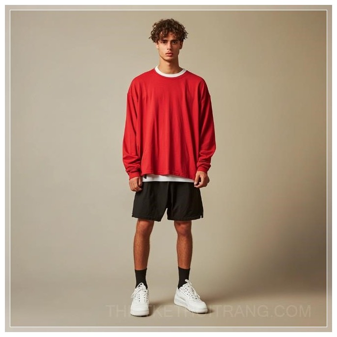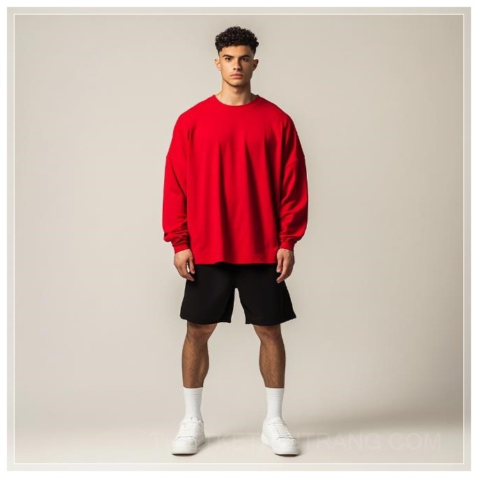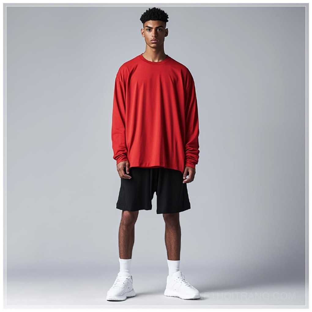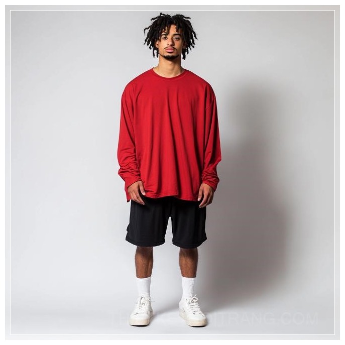 Trong một khoảnh khắc thời trang đơn giản nhưng đầy ấn tượng, người mẫu nam khoác lên mình chiếc áo thun dài tay màu đỏ tươi, với thiết kế rộng rãi và tay áo bo rộng, tạo nên vẻ ngoài phóng khoáng và thoải mái. Áo thun này không chỉ bắt mắt mà còn rất hợp với xu hướng thể thao hiện đại, thể hiện sự kết hợp giữa phong cách và sự dễ chịu trong mọi hoạt động.