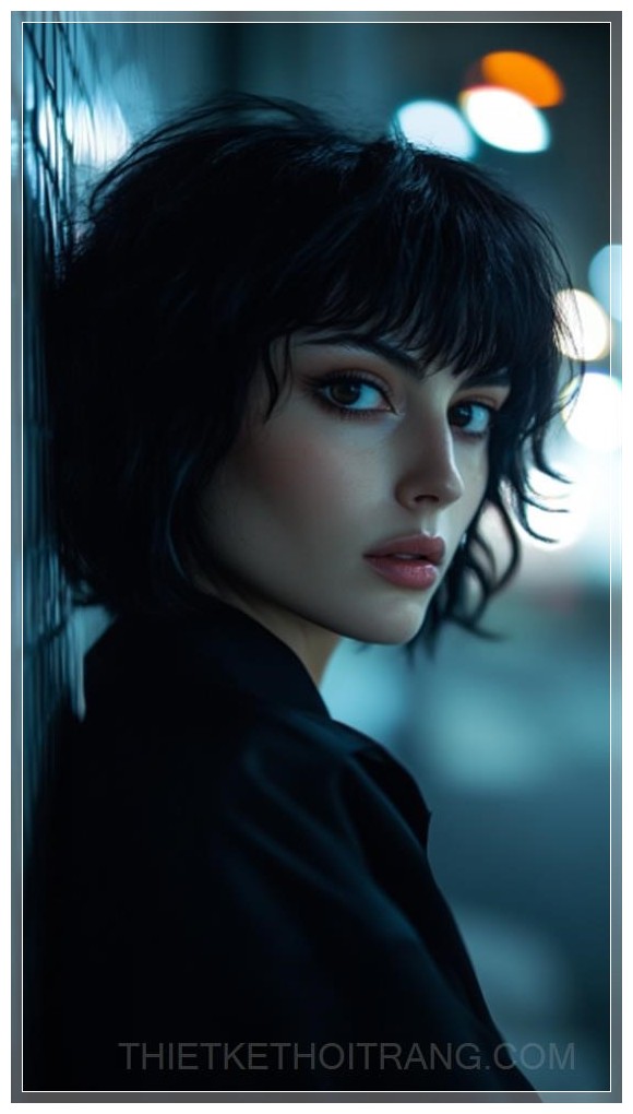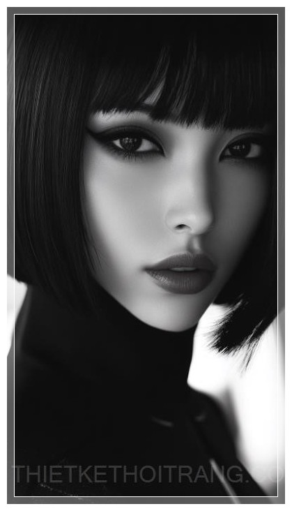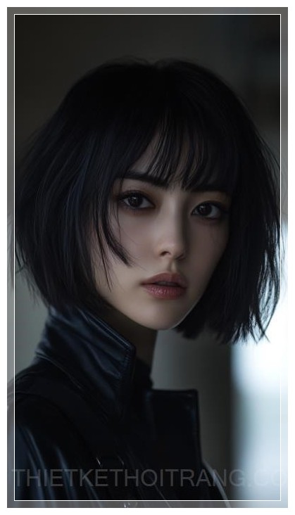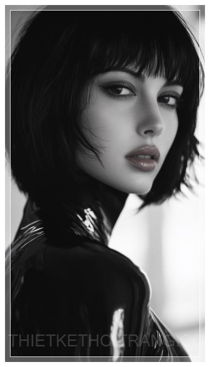 Chiếc váy sẫm màu và kiểu tóc tối giản của Motoko Kusanagi, với màu đen dày và óng ánh, là điểm nhấn trong bức ảnh, tôn lên vẻ sang trọng và hiện đại. Đôi mắt sâu thẳm, lạnh lùng nhưng lại ẩn chứa những chiều sâu nội tâm, được chiếu sáng dưới ánh sáng dịu dàng từ các nguồn sáng điện ảnh, làm nổi bật sự tinh tế trong từng chi tiết.