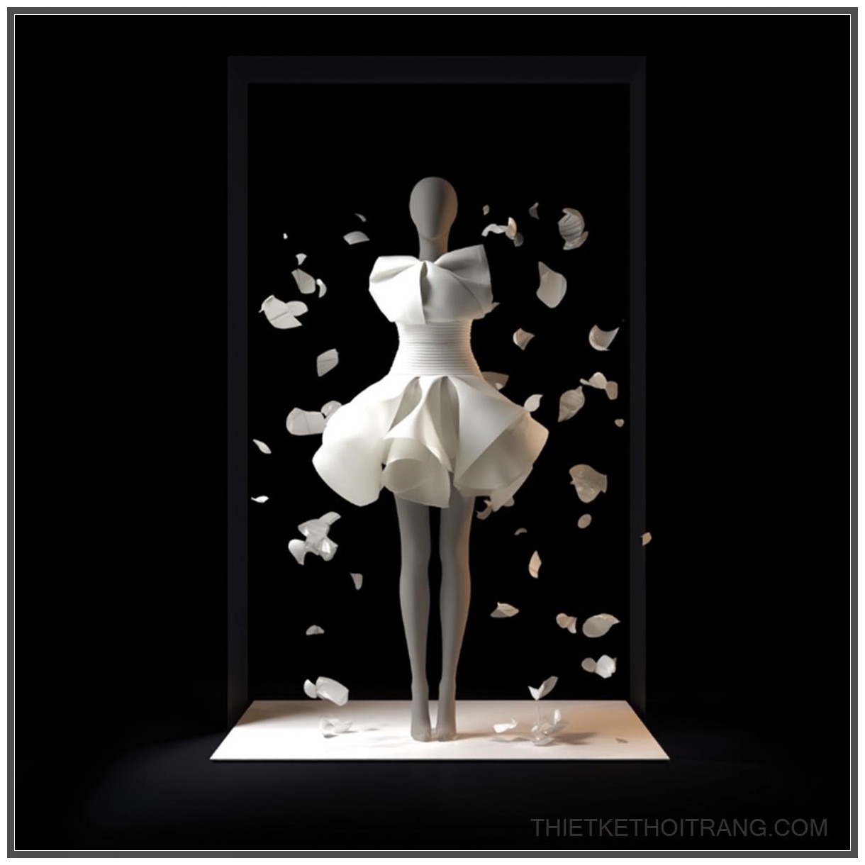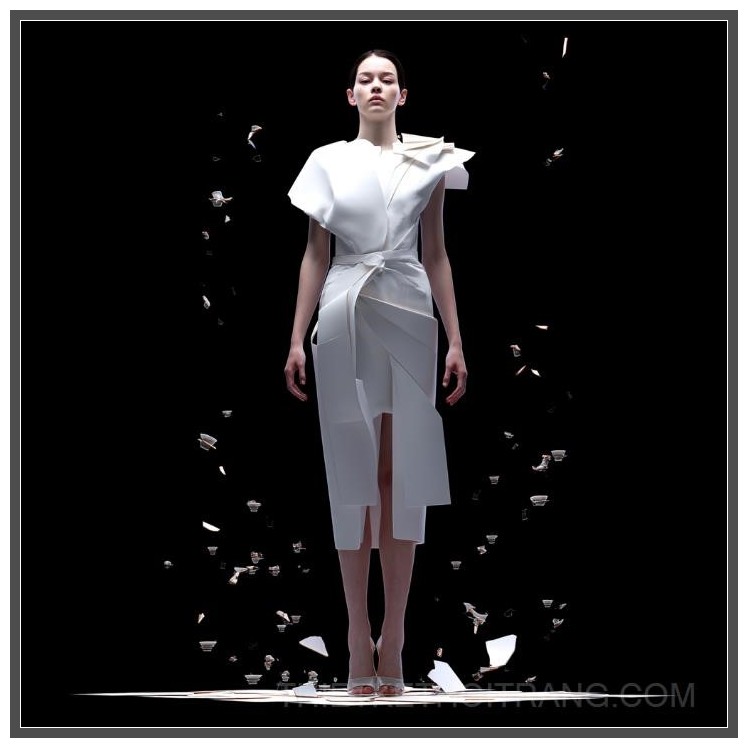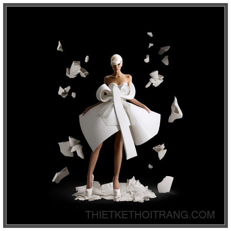 Phông nền đen với những mảnh sứ trắng trôi nổi tạo nên một không gian hoàn toàn khác biệt, không chỉ làm nổi bật chiếc váy mà còn tạo ra một sự liên kết giữa nghệ thuật và thời trang. Sự tương phản mạnh mẽ giữa màu trắng tinh khiết của chiếc váy và nền đen huyền bí mang lại một cảm giác hiện đại, đầy tính nghệ thuật. Mọi chi tiết đều được tinh chỉnh hoàn hảo, từ ánh sáng sân khấu đến góc chụp tạo ra những hiệu ứng thị giác mạnh mẽ, khiến chiếc váy trở thành một tác phẩm nghệ thuật thực sự.